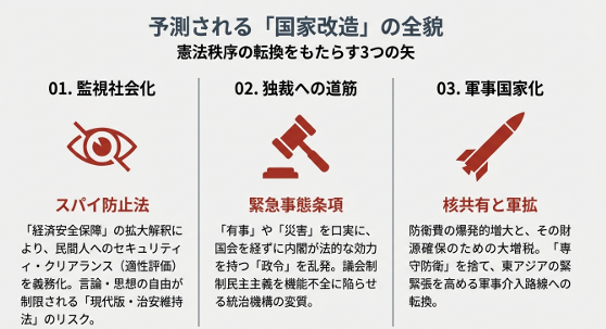 現在、高市早苗首相率いる自民党と、保守色を強める連立与党が衆院選で過半数を維持、あるいは「絶対安定多数」を確保した場合、戦後日本が維持してきた憲法秩序と社会構造は、根本的な変容を遂げる可能性が高いと考えられます。