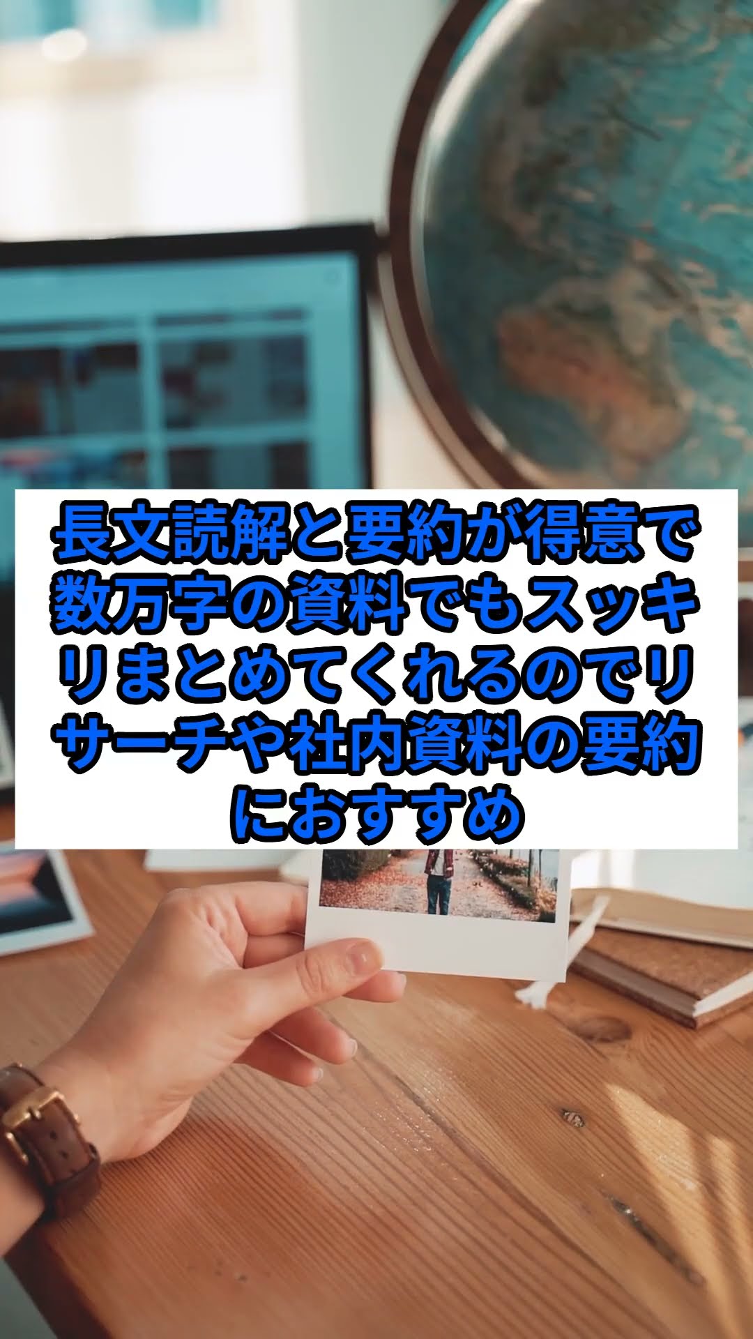 長文読解と要約が得意で数万字の資料でもスッキリまとめてくれるのでリサーチや社内資料の要約におすすめ